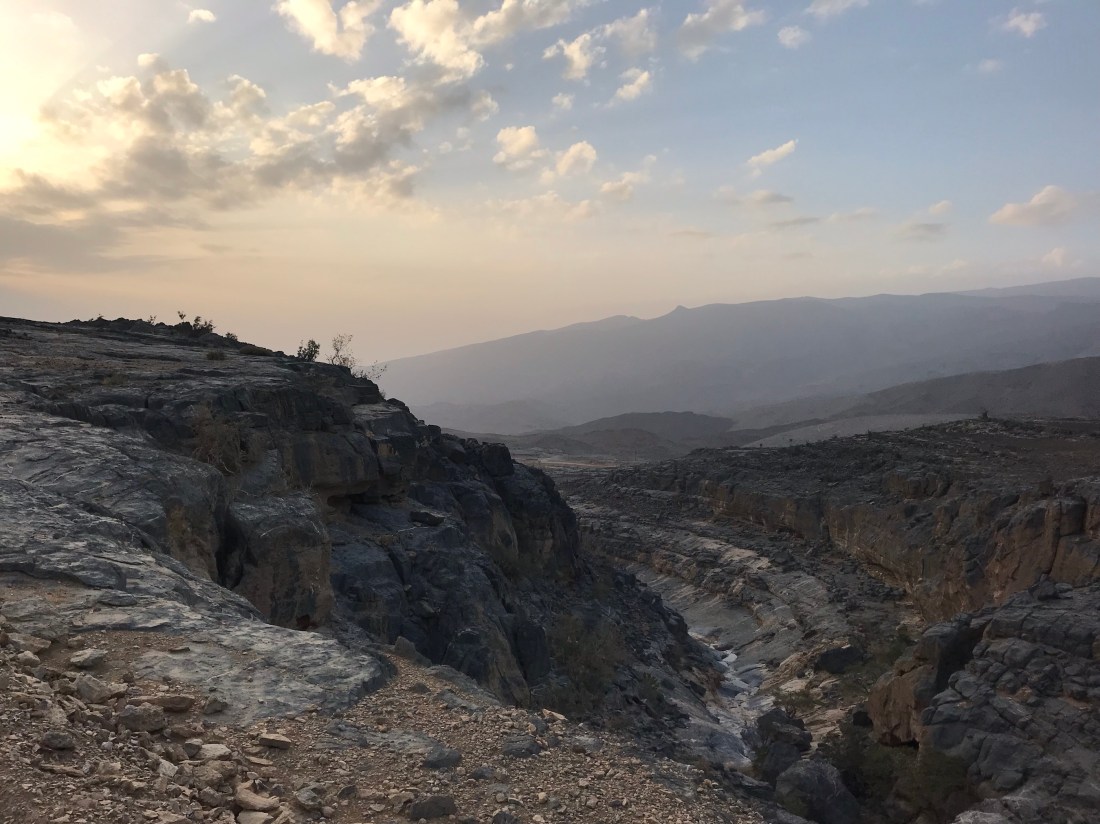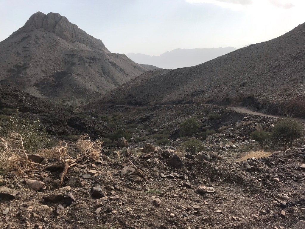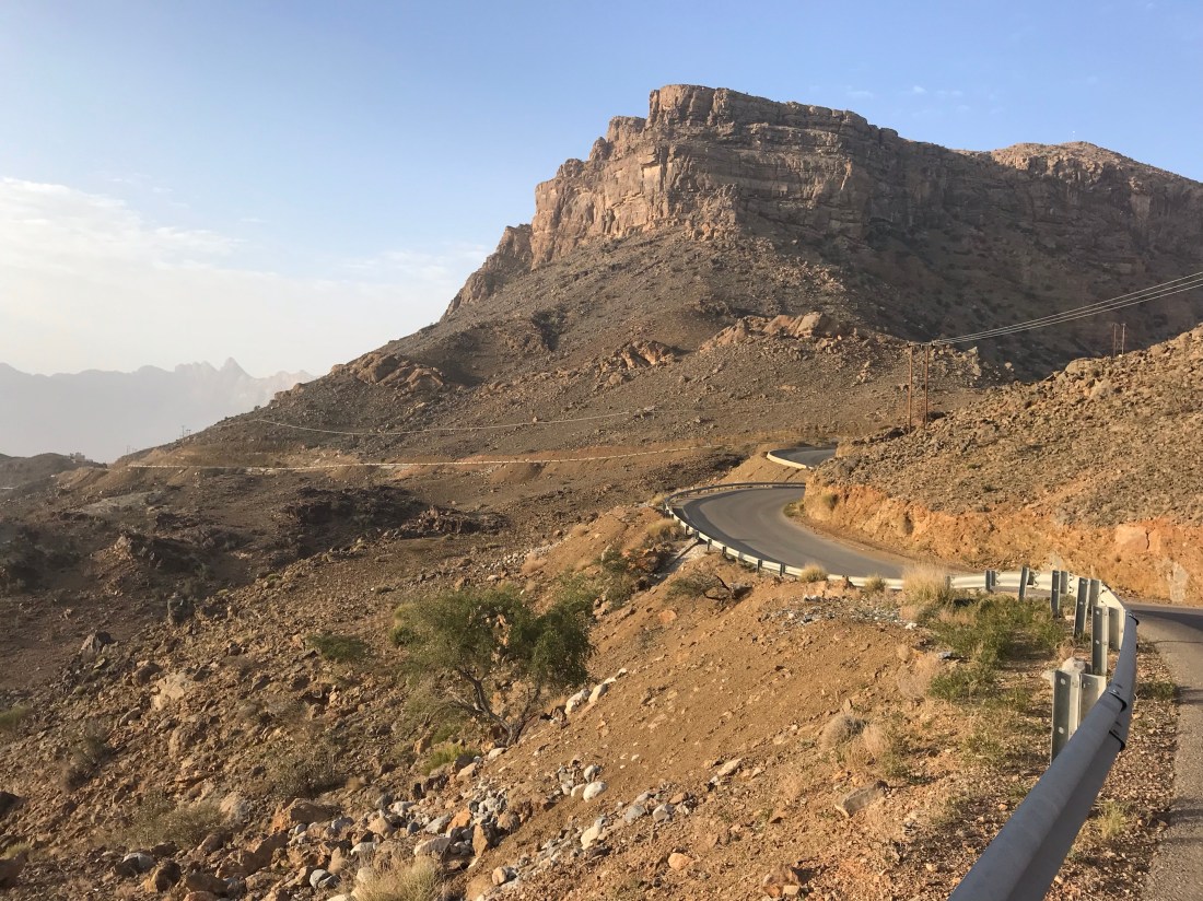 The gravel climb rose to about 1200m and was pretty rough in parts. There was then a sharp descent to join the main road climb up to Jebel Shams. Without a front brake I had to walk down the steeper sections after a couple of scary rear brake lockups that could have been a bit disastrous. I reckon I had to walk for about 20/30 minutes in total.