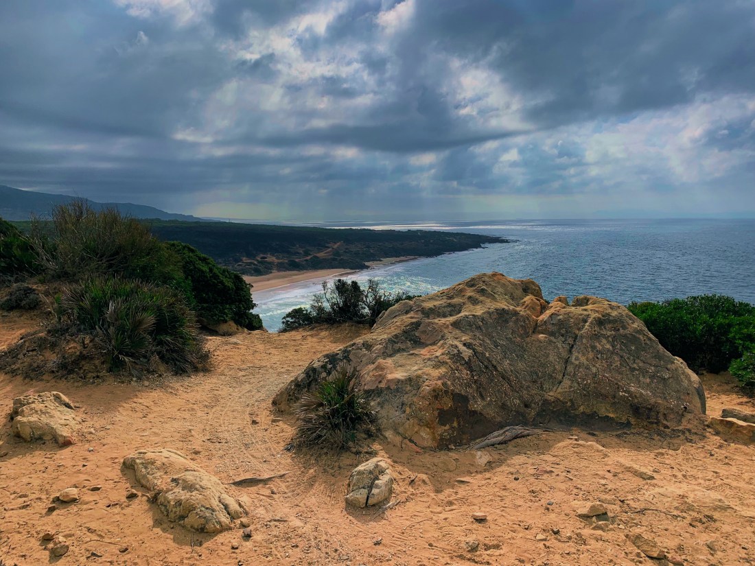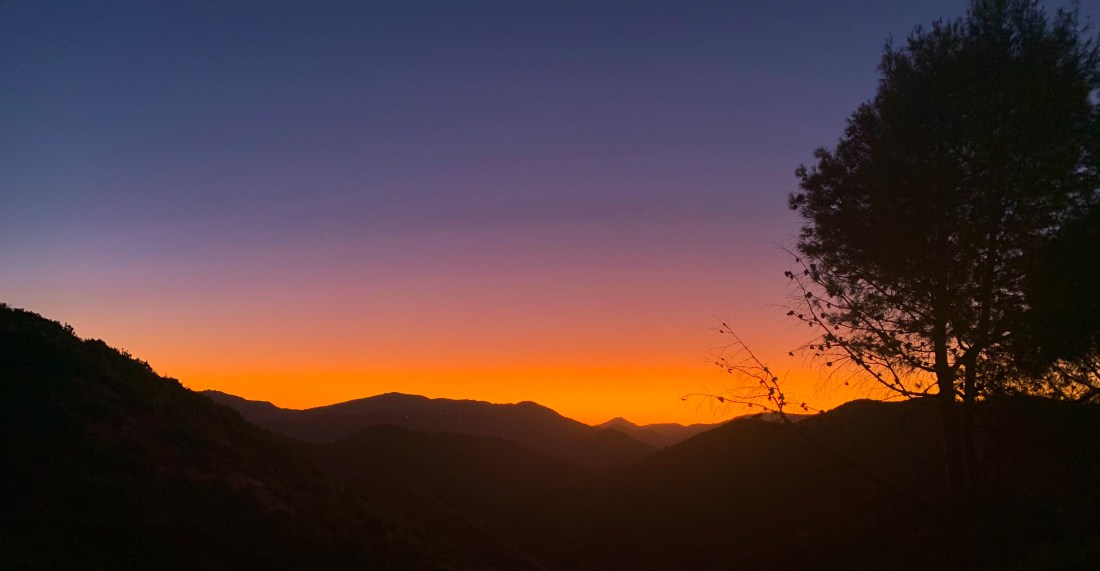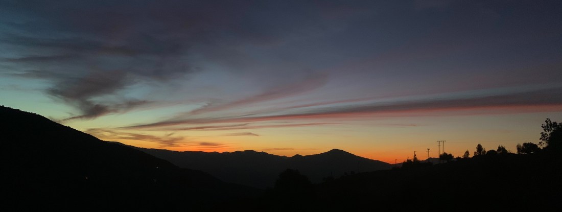 At the top of a small climb I found a remote area of flat ground with a few low bushes to hide behind. It was warm and I put on a jacket, laid out the sleeping mat and wrapped the lightweight groundsheet over me for a few hours kip. The half moon was falling to the horizon and lying there looking up at bright stars was one of those special moments. The only downside was the pain from my ribs and a couple of lads arriving in a car a few meters from my bivouac and stopping to listen to loud music for half and hour! I couldn’t really tell them to go away!