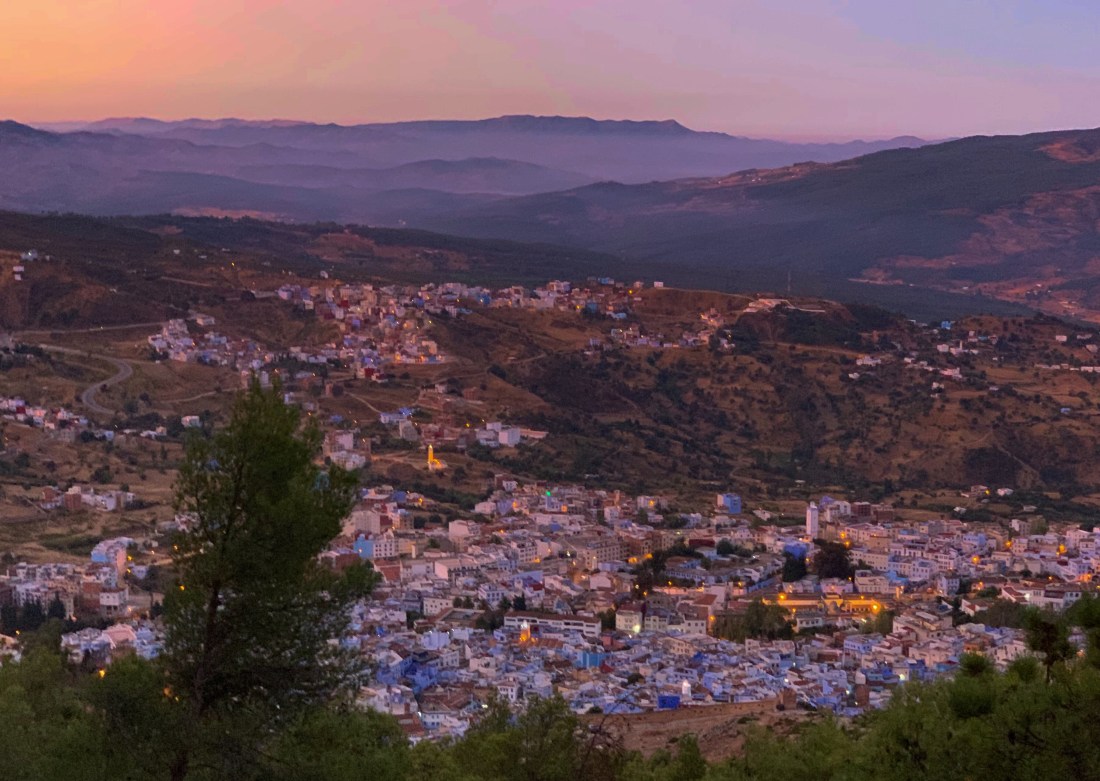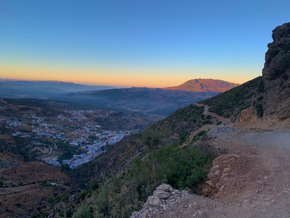 Once over the top of the climb there was a short descent and Chechaouen came into view in the evening twilight deep down in the valley below.