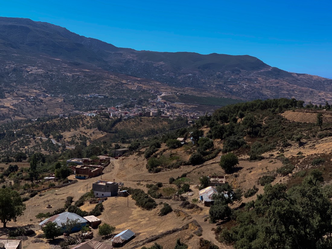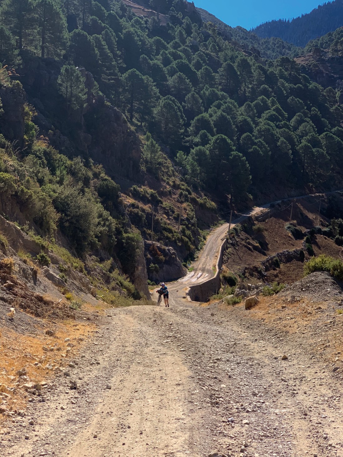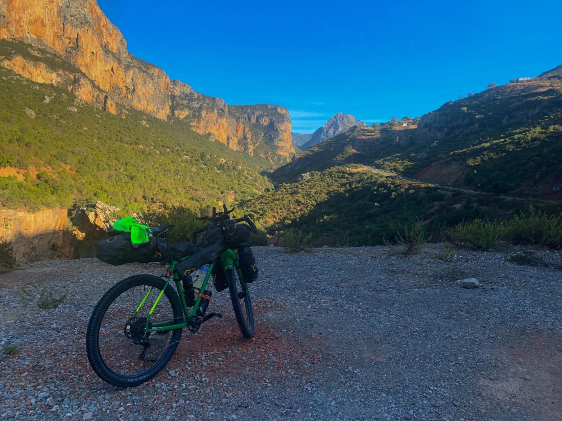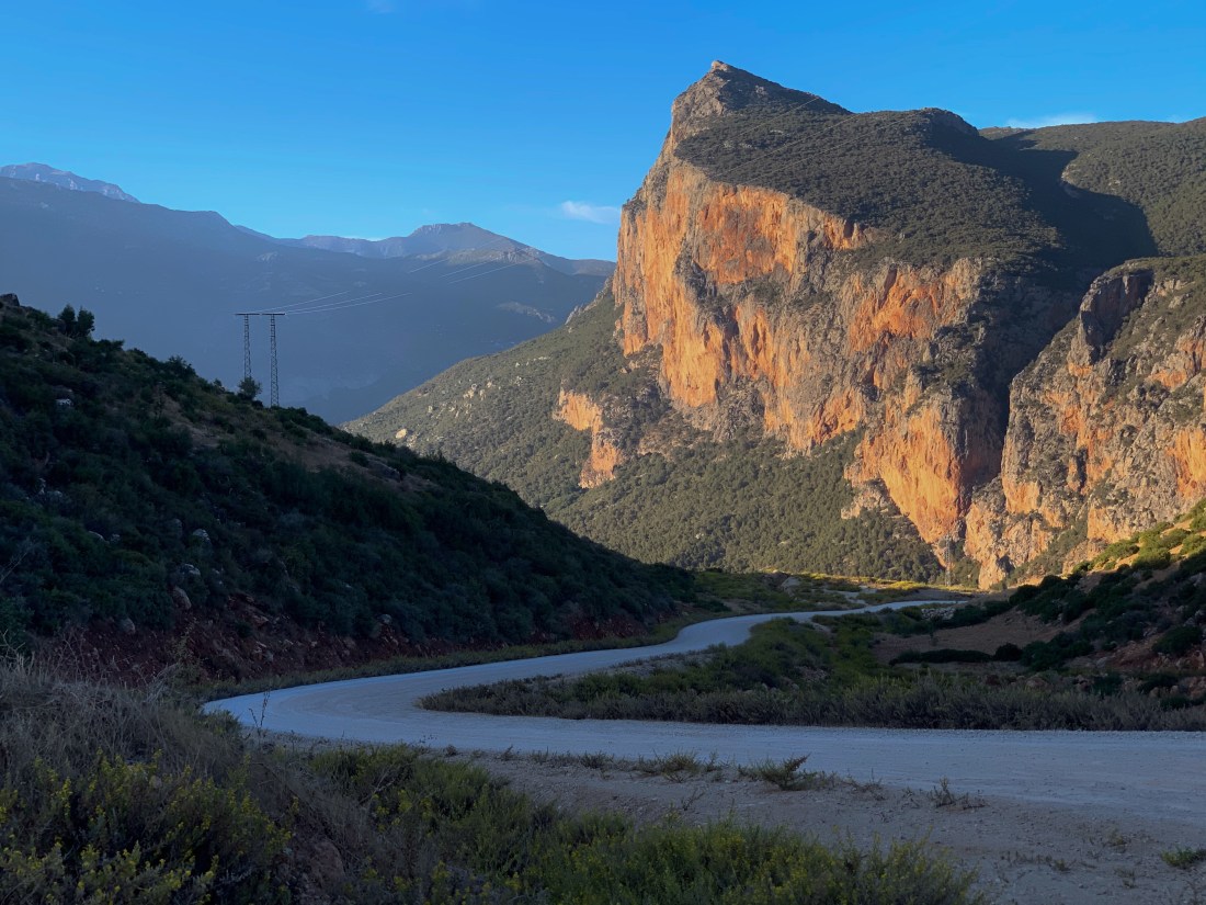 I climbed out of the town and back onto the gravel/rock/sand road that climbed pretty steeply to the summit of the first mountain at 1800m. And what a morning it was. The road was little used and headed towards the Riff cannabis farms that make the area famous. The going was tough and on numerous occasions I had to push the bike up sharp ramps where the surface was too loose or rocky to ride.