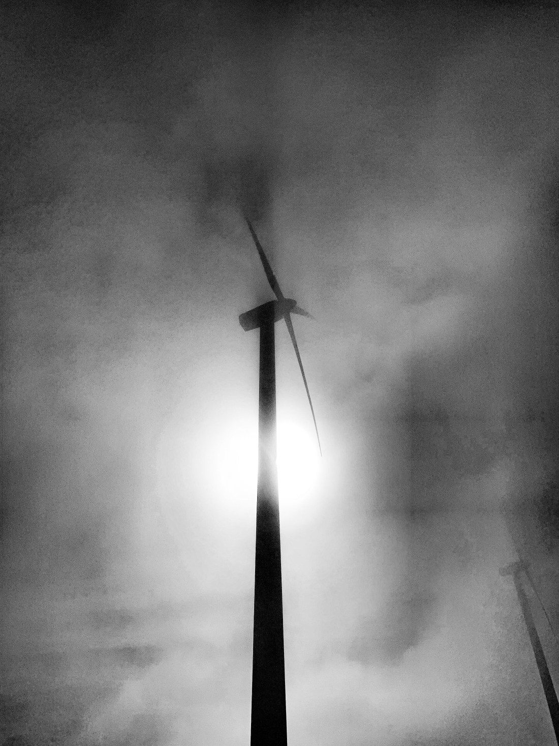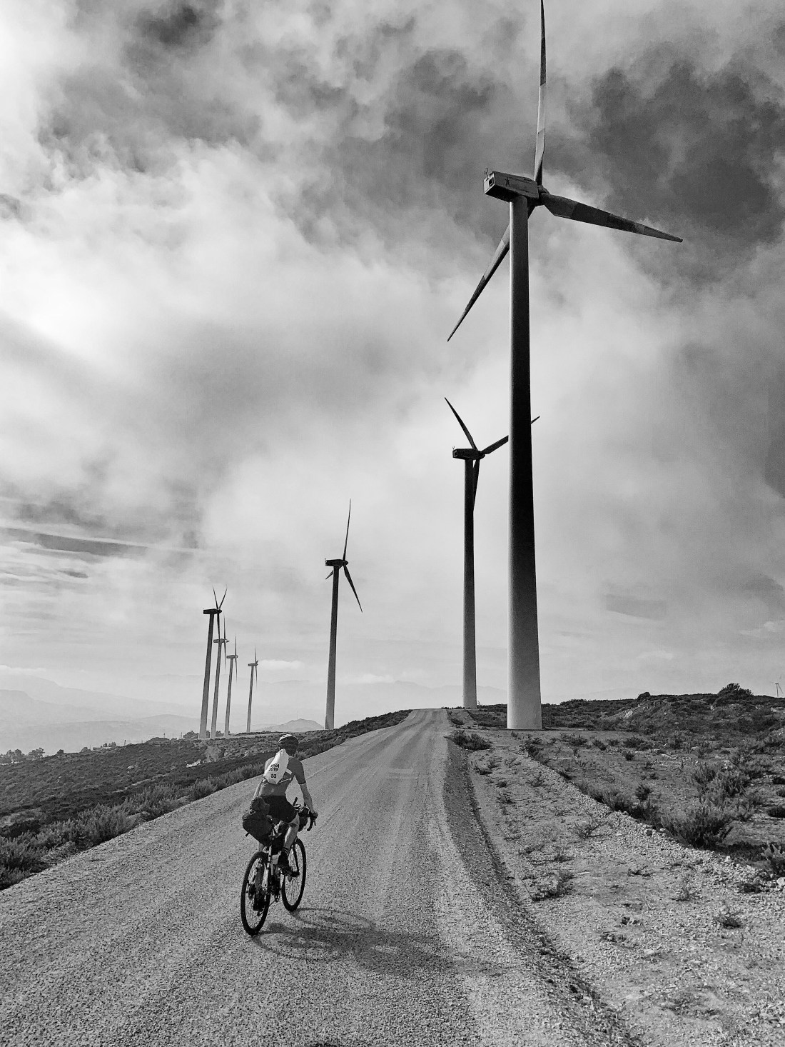 We were soon up among a farm of massive wind turbines, blades whirring in the clouds with the occasional hazy sun visible.
